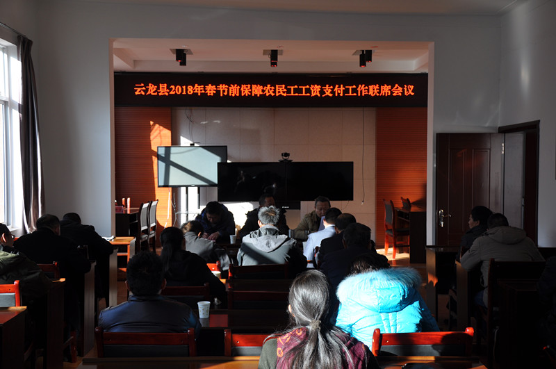 2018年1月10日上午,云龙县农民工工资支付领导小组办公室召开云龙县2018年春节前保障农民工工资支付工作联席会议。县农民工工资支付领导小组办公室介绍了近期县内在建项目建设中存在问题的督查和整改情况,对下一步工作重点作了要求;县劳动监察大队组织学习了相关业务政策,要求各部门确保业务工作按期完成;县委维稳办传达学习省、州有关农民工工资问题的文件材料,确保全国、省、州、县两会期间、春节前的稳定;各成员单位及受邀企业做了相关情况介绍,对存在的风险项目作了排查筛选,要求各主管部门加强监控工作。会议要求,各乡镇、各行业主管部门要认真履职,切实落实好“四重责任”、做好“六员监管”、抓好“七项制度”,为确保农民工权益得到切实保障,过上一个祥和的春节创造条件。