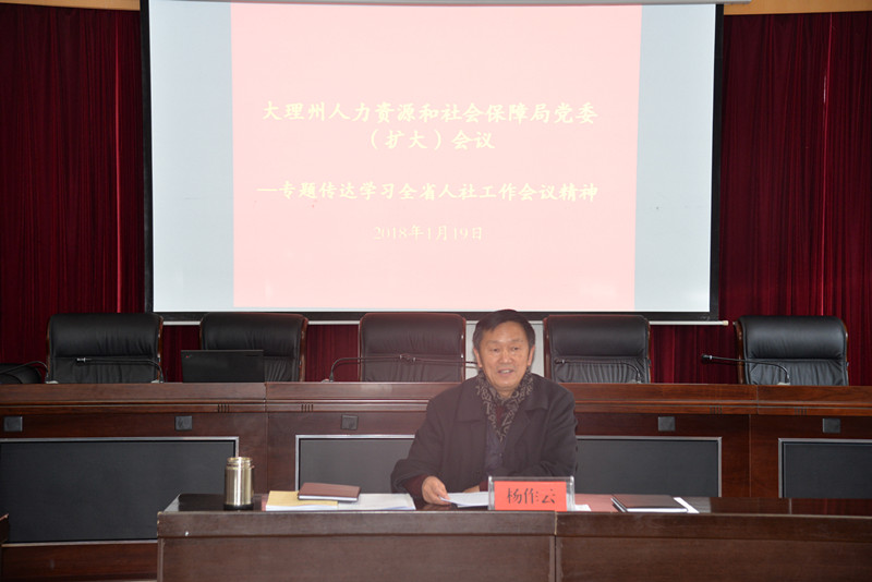 2018年1月19日上午,大理州人社局召开党委扩大会议专题传达学习2018年全省人社工作会议精神,大理州人社局党委书记、局长杨作云同志主持会议并传达会议精神,州人社局党委委员、局属各科室(单位)主要负责人40余人参加会议。
