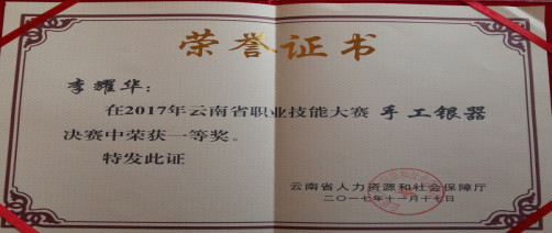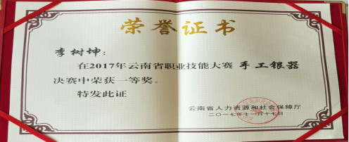 2017年云南省职业技能大赛手工银器决赛11月17日在丽江落下帷幕,在现场随机抽题限时制作决赛中,鹤庆县参赛选手成绩优异,来自草海镇的选手李耀华、李树坤2人包揽全省一等奖,其他选手荣获二等奖1人,三等奖3人。鹤庆县6名参赛选手在丽江束河古镇决赛现场努力拼搏,奋勇争先,精湛技艺,充分展示出的技能风采,让在场的评委专家和游客赞叹不已。